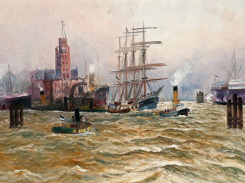 Gemälde: Alfred_Jensen, Ende 19. Jahrh.- Hamburger Hafen, Kaispeicher mit_Schleppern_und_Viermastbark