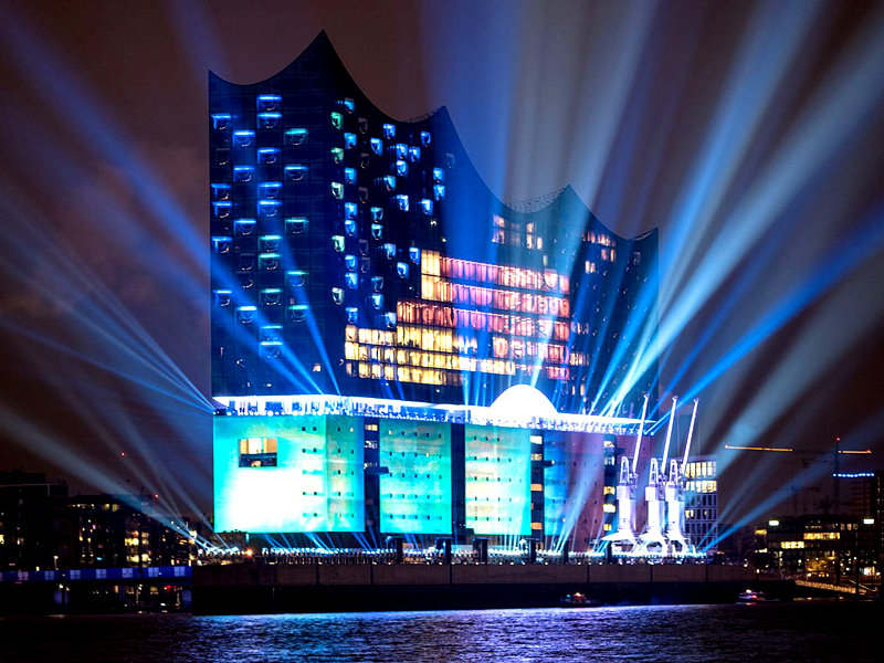 Lichtspektakel zum Eröffnungskonzert der Elbphilharmonie 2017, gesteuert durch die Musik