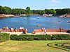Rund um das Planschbecken; in der große Sandkiste wird Beach-Volleyball gespielt