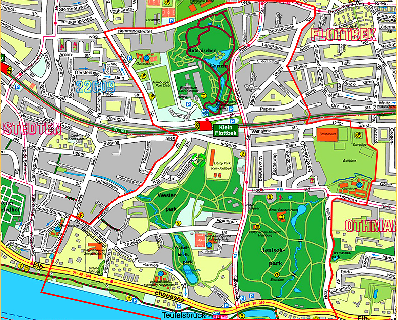 Gemarkung. Das Gebiet nördlich des Bahnhofes "Klein Flottbek" - einschließlich des Botanischen Gartens - gehört zum Stadtteil Osdorf sowie Teilbereiche