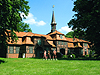 sowie einem etwas gedrungen wirkenden Turm. Die Verwendung von Backsteinen, Fachwerkfassaden und traditionellen Ziersetzungen im
